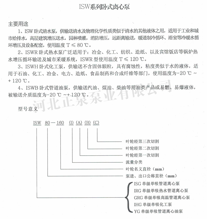 ISW型臥式管道離心泵,管道循環泵,管道增壓泵,供輸送清水及物理化學性質類似于清水的其他液體之用,,適用于工業和城市給排水、高層建筑增壓送水、園林噴灌、 消防增壓、遠距離輸送、暖通制冷循環、農田灌溉,重型工業循環水用泵等冷暖水循環增壓及設備配套,使用溫度T<80℃。
